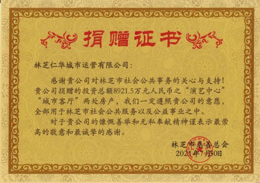 2021年7月30日下午,仁和集團下屬林芝項目單位——林芝仁華城市運營有限公司與林芝市慈善總會正式舉行捐贈簽約儀式,將投資總額約8921.5萬元、建筑總面積11640.37平方米的自建房產工布天街項目中的“演藝中心”“城市客廳”無償捐贈與林芝市慈善總會,用于林芝市發展社會公共服務以及公益事業。善心善舉,彰顯了仁和強烈的社會擔當。