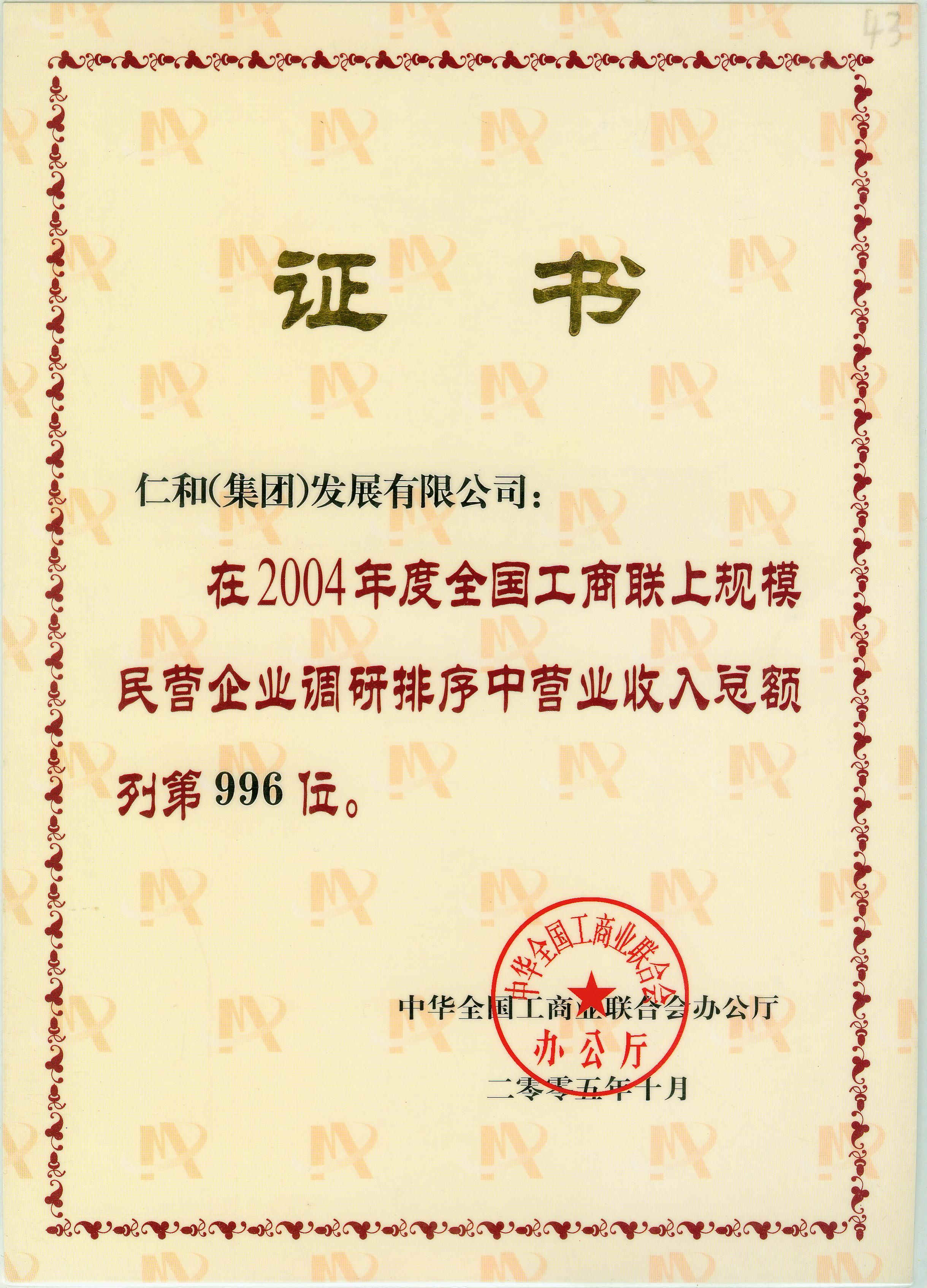 2004年度全國工商聯上規模民營企業調研排序中營業收入總額列第996位 發布時間: 2019年12月18日 14:39:53 閱讀量: 9,318 下一篇:2004年國家工商行政管理總局守合同重信用企業上一篇:2004年榮獲全國守合同重信用企業